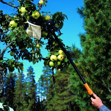 Deze fruitplukker van Fiskars kan eenvoudig worden gemonteerd op de Fiskars snoei-giraffe, om zo makkelijk en effectief op hoogte fruit te plukken. De snoei-giraffe maakt het mogelijk om op moeilijk bereikbare plaatsen, zoals boomtoppen of juist dicht op de grond, toch makkelijker en vooral in een goede houding fruit te plukken. Het interne koordsysteem zorgt voor een enorme krachtbesparing tijdens het snoeien. Snoeien op grote hoogte kan door de trekknop aan het einde van de steel. De flexibele snoeikop kan 230° in alle posities ingesteld worden. De Fiskars snoei-giraffes zijn ontwikkeld volgens de Fiskars designfilosofie: duurzaam en ergonomisch tuingereedschap ontwikkelen, waarmee tuinieren makkelijker, lichter, efficiënter en eenvoudigweg leuker wordt.