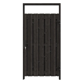 De tuindeur recht grenen geschaafd geïmpregneerd en gedompeld antraciet op zwart stalen frame is 180 cm hoog, 100 cm breed, 5,5 cm diep en heeft weinig doorkijk. De tuindeur bestaat uit 13 verticale planken die met RVS schroeven op een zwart stalen frame zijn vastgemaakt. De tuindeur is tweezijdig, kan zowel links- als rechtsdraaiend gemonteerd worden en wordt inclusief hengen geleverd.