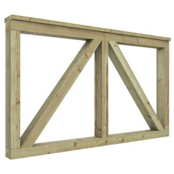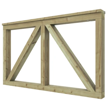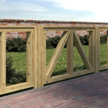 De poort is gemakkelijk te bevestigen tussen 2 palen. Gebruik hiervoor 2 duimhengen met verzet. Deze dient 20cm korter te zijn dan de totale lengte van de poort. Bevestig de hengen met een slotbout en houtboutschroeven aan de poort. Bevestig op de palen de (verstelbare) duimen op de zelfde hoogte. Vervolgens kan de poort gemakkelijk in de duimen geplaatst worden. Bevestig vervolgens een boerenklinkstel op de poort en paal om netjes de paal te kunnen sluiten.