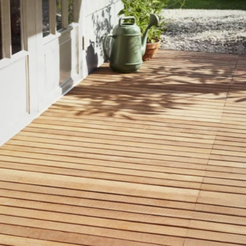 De vlondertegel hardhout bestaat uit 14 gladde latjes in plaats van geprofileerde latjes. Ondanks dat het lijkt dat de tegels gladder worden bij regen valt dit vaak mee, omdat in de profielen geprofileerde latjes zit vaak een ophoping van algen waardoor de tegel glad wordt. Met deze gladde latjes is hier geen sprake van. Onderhoud wel de hardhouten goed door regelmatig met harde bezem deze af te vegen.